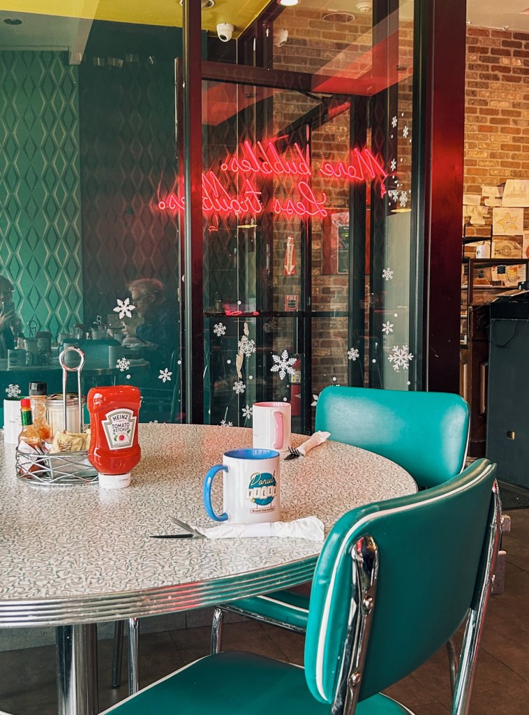 The Donut Villa’s menu is an innovative take on American breakfast classics, and offers an eclectic and unmistakably non-continental array of vegetarian wraps, grilled cinnamon rolls, open-face sandwiches, Eggs Benedict, and more. (It would be easy to imagine a vintage jukebox here! Their mix was playing Bruce Springsteen when we entered).